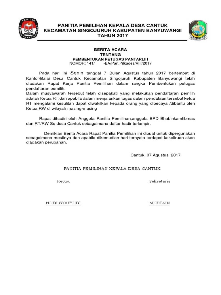 Langsungsaja untuk mengefesiensi waktu dalam acara ini, izinkan saya membacakan susunan . Contoh berita acara penjaringan bakal calon kepala desa. Melengkapi susunan kepanitiaan bisa ditunjuk langsung dari ketua panitia atau dasar musyawarah bersama (rapat dengar pendapat). Susunan,tugas, wewenang dan tanggungjawab panitia pemilihan3. Apakah sobat desa sedang mencari contoh berita acara pembentukan panitia pilkades terbaru?